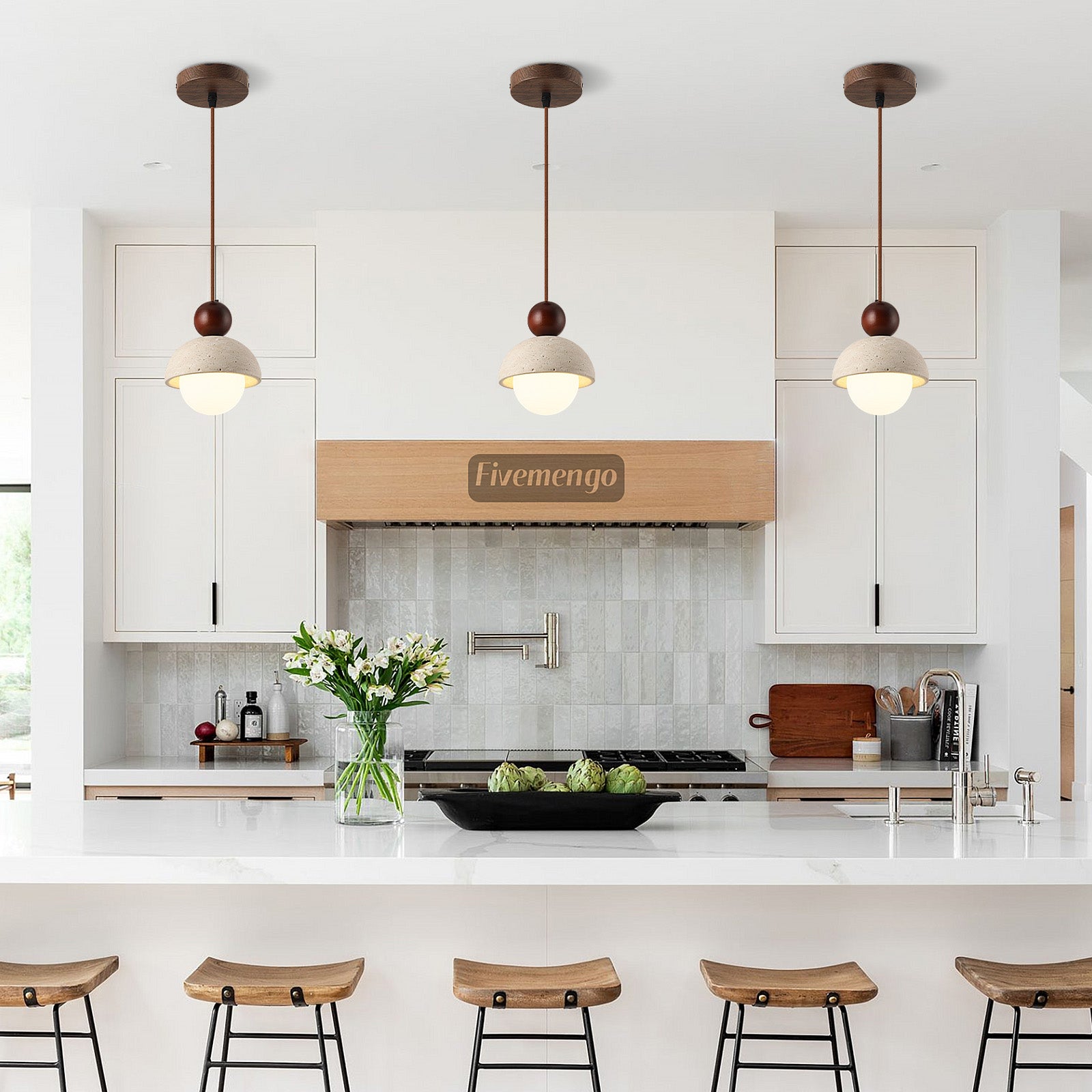 - MATERIAL COMPOSITION: This wabi-sabi kitchen island light features hand-polished natural travertine stone lampshade, frosted glass and walnut wood ring, creating an elegant Japandi-inspired design, simple & natural style