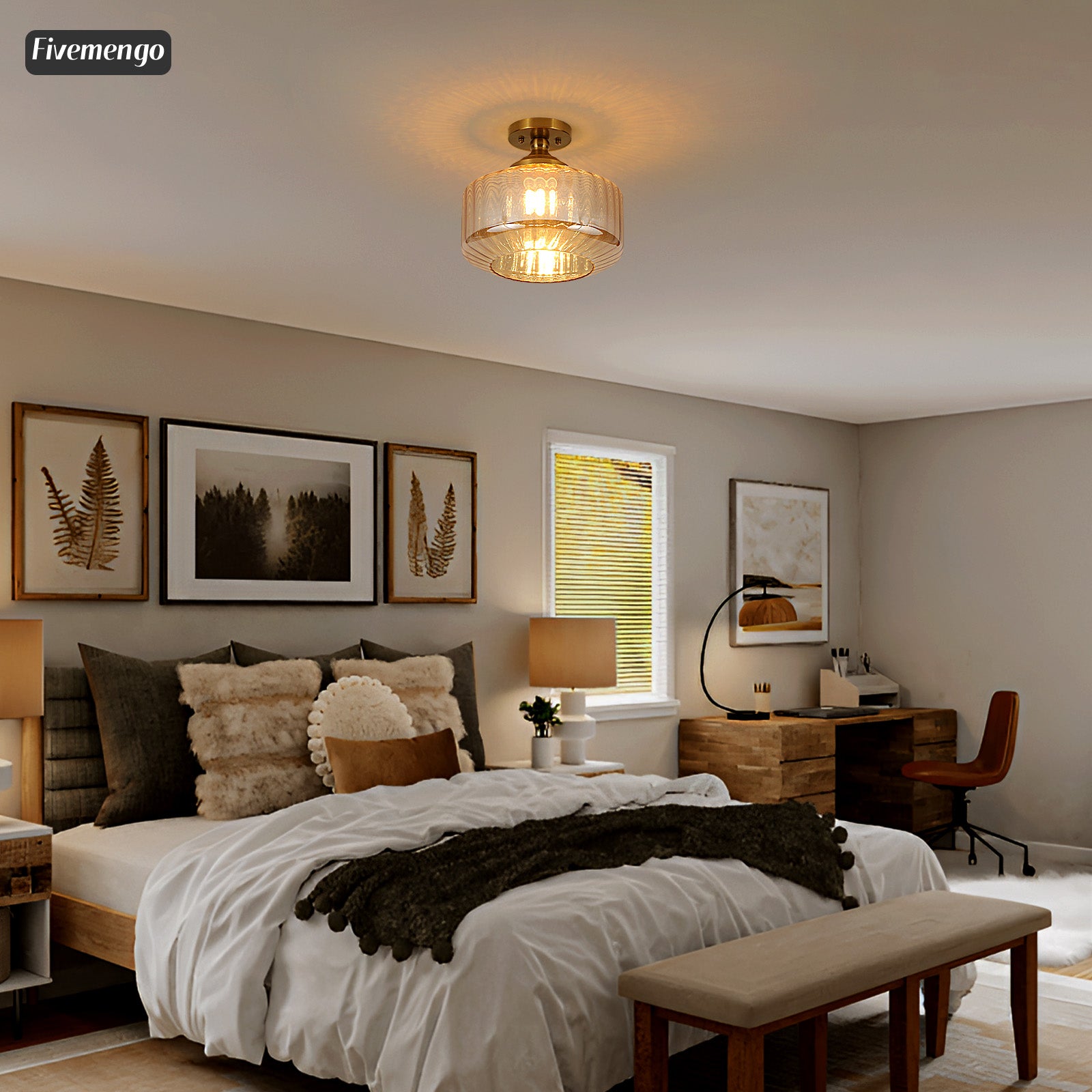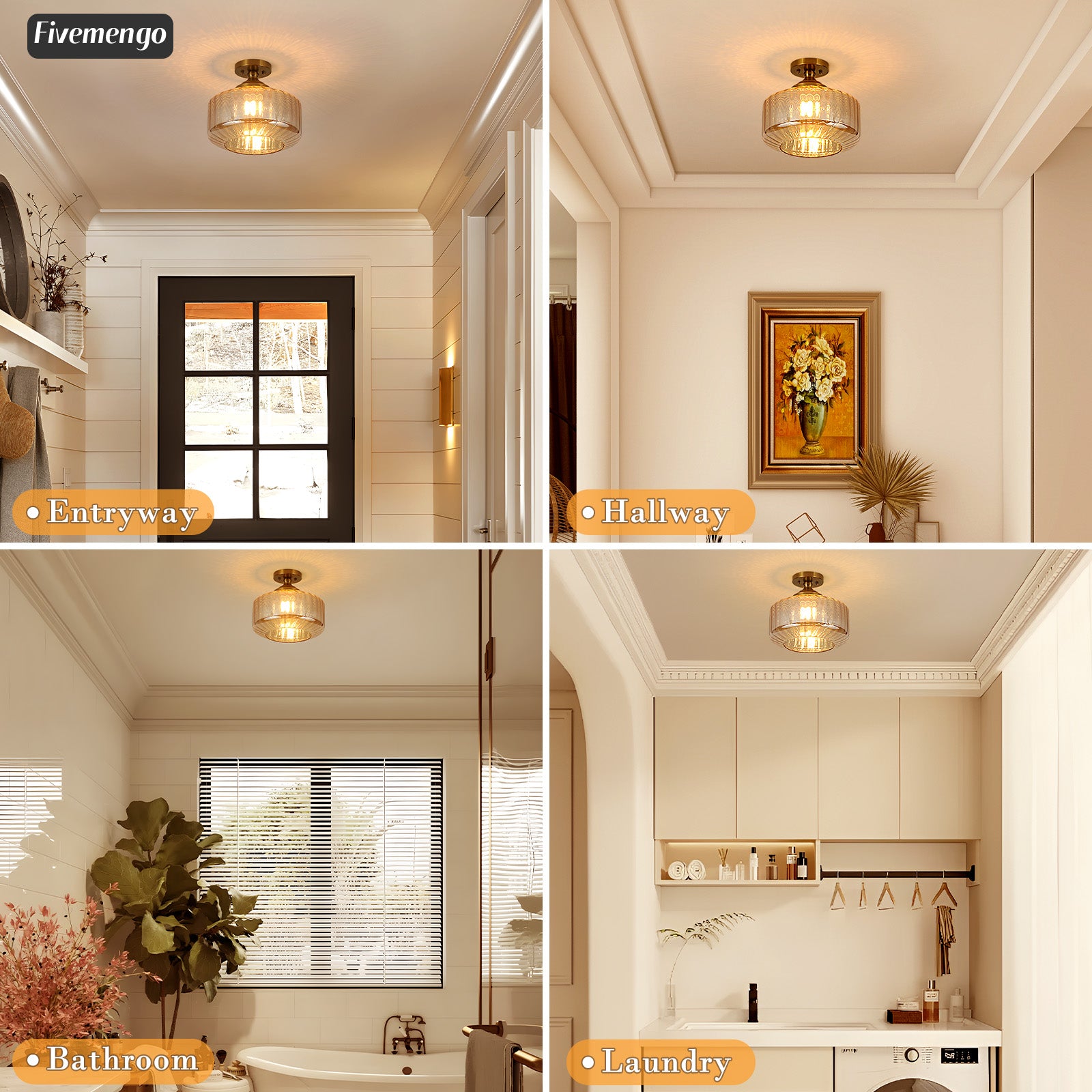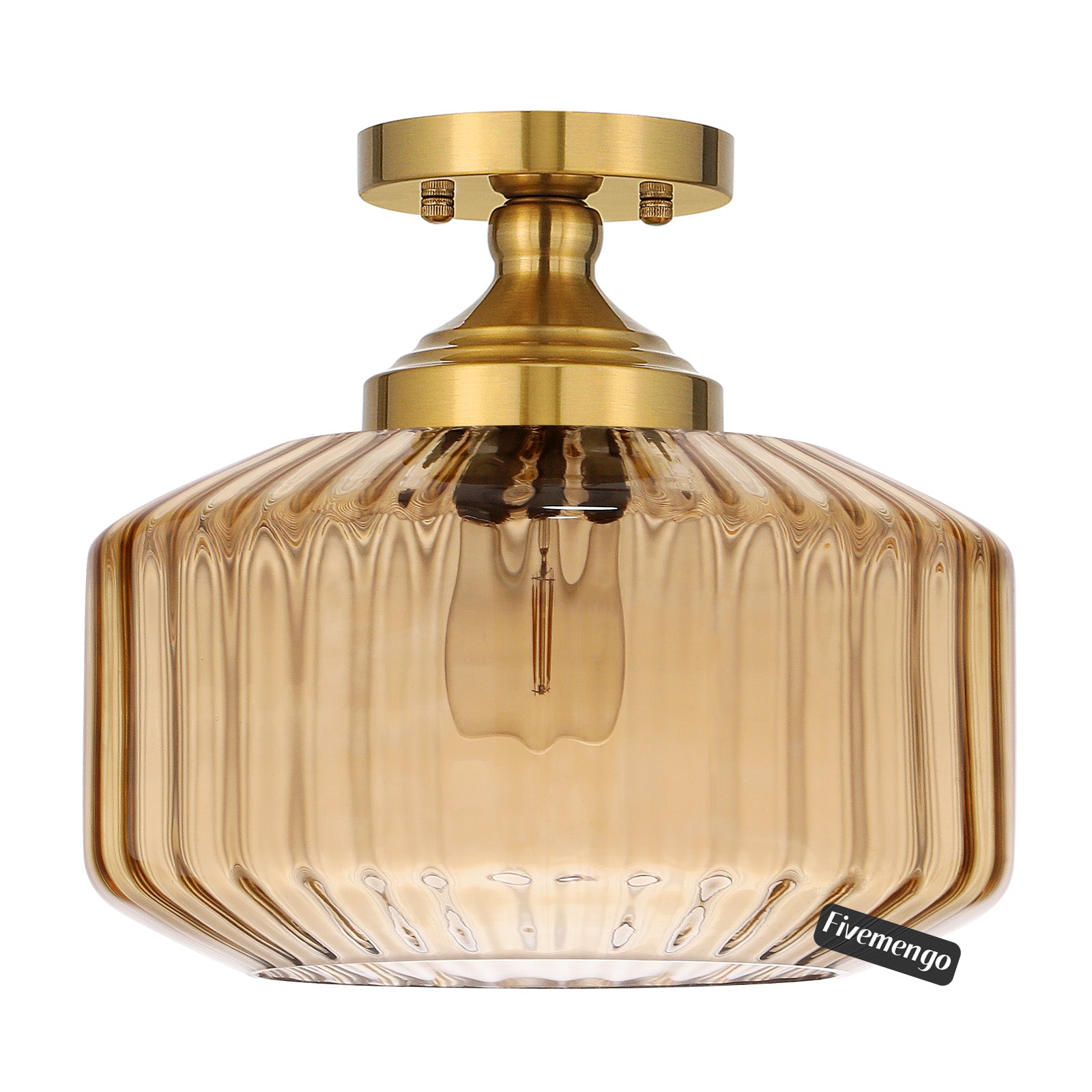 Fivemengo 11.8in Semi Flush Mount Ceiling Light Fixture, Vintage Striated Glass Kitchen Lighting Fixtures Ceiling Mount for Entryway Hallway Bedroom Dining Room Bathroom Foyer Laundry (Amber)