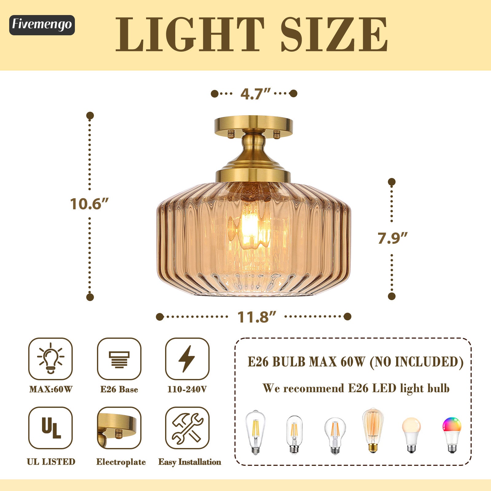 - DIMENSIONS: Close to ceiling light fixtures measures 11.8 inches in diameter and 10.6 inches in height, with a 7.9-inch glass shade depth, ideal for standard ceiling heights
