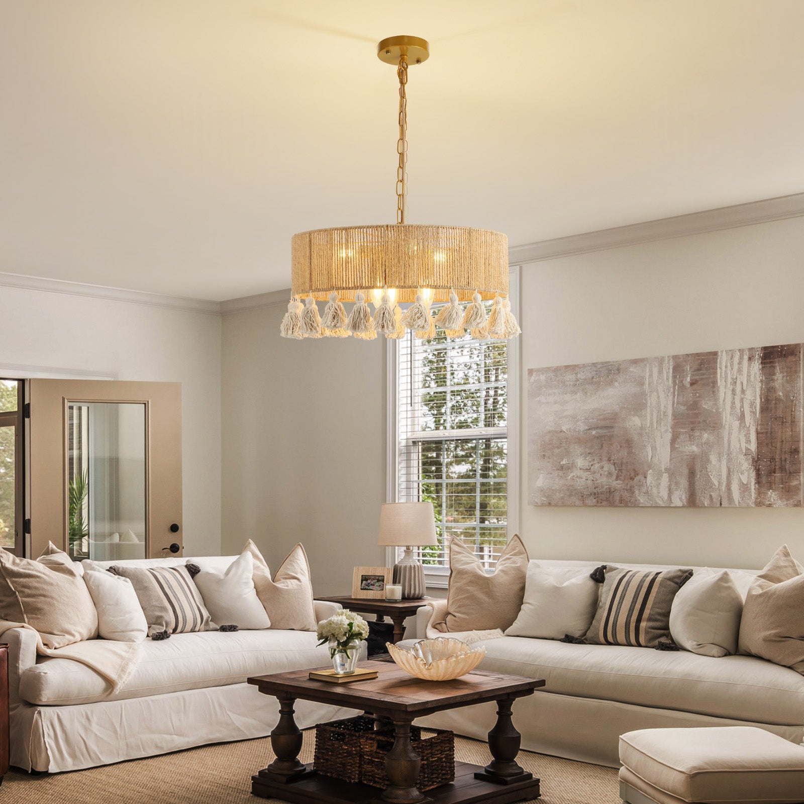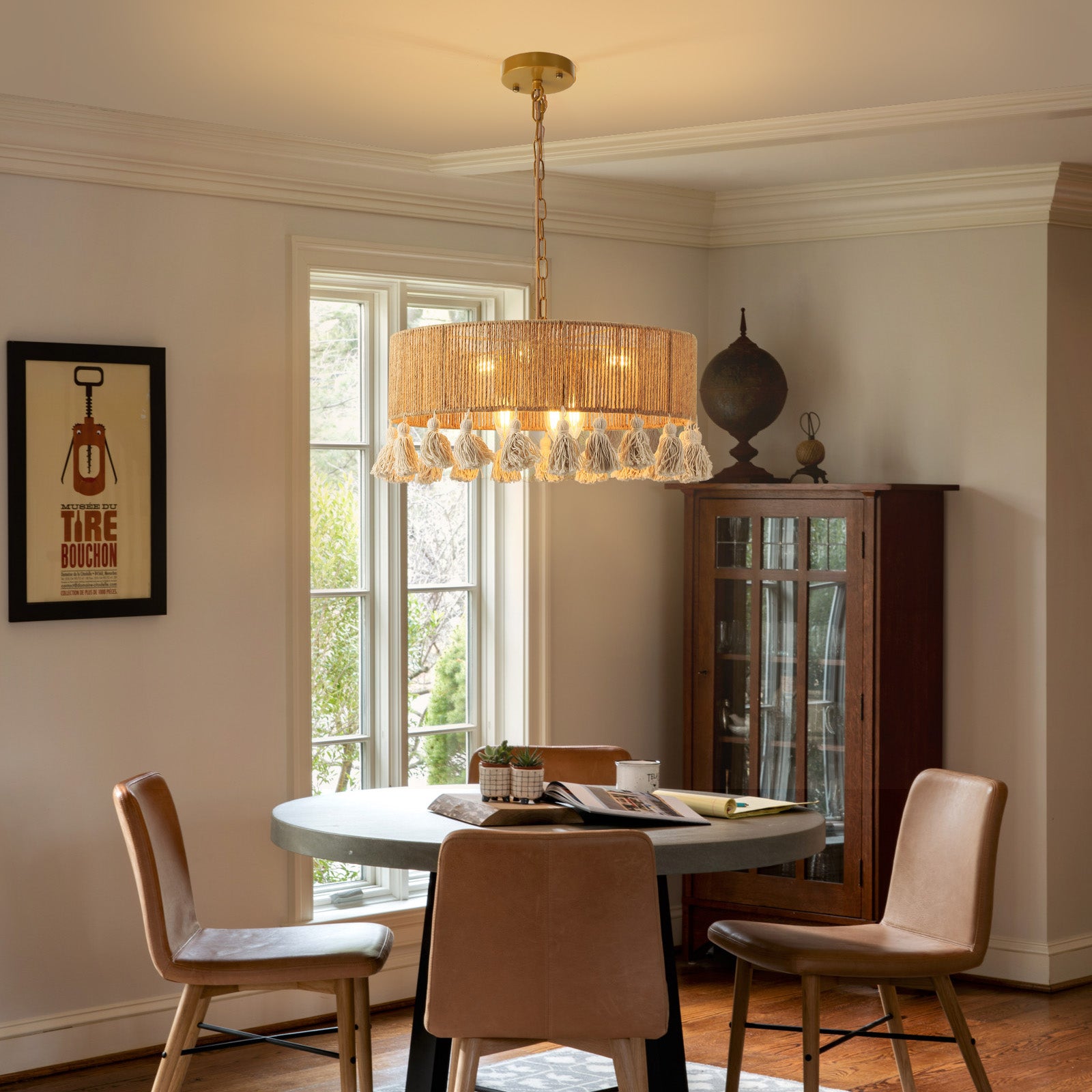 Fivemengo Rattan Chandelier 20in 6-Lights Rattan Pendant Light, Boho Hand-Woven Hemp Rope & Cotton Beards, Hanging Light Fixture Living Dining Room Over Kitchen