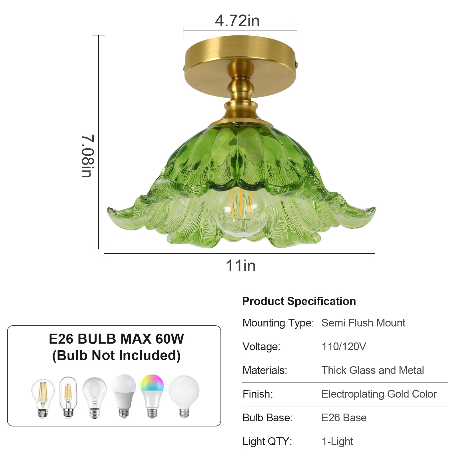 Pandaluna 关联视频下载 主图换背景 Semi Flush Mount Ceiling Light Fixture, 11in Green Glass Vintage Light Fixtures Ceiling for Hallway Kitchen Foyer Entryway Bedroom, E26 Base