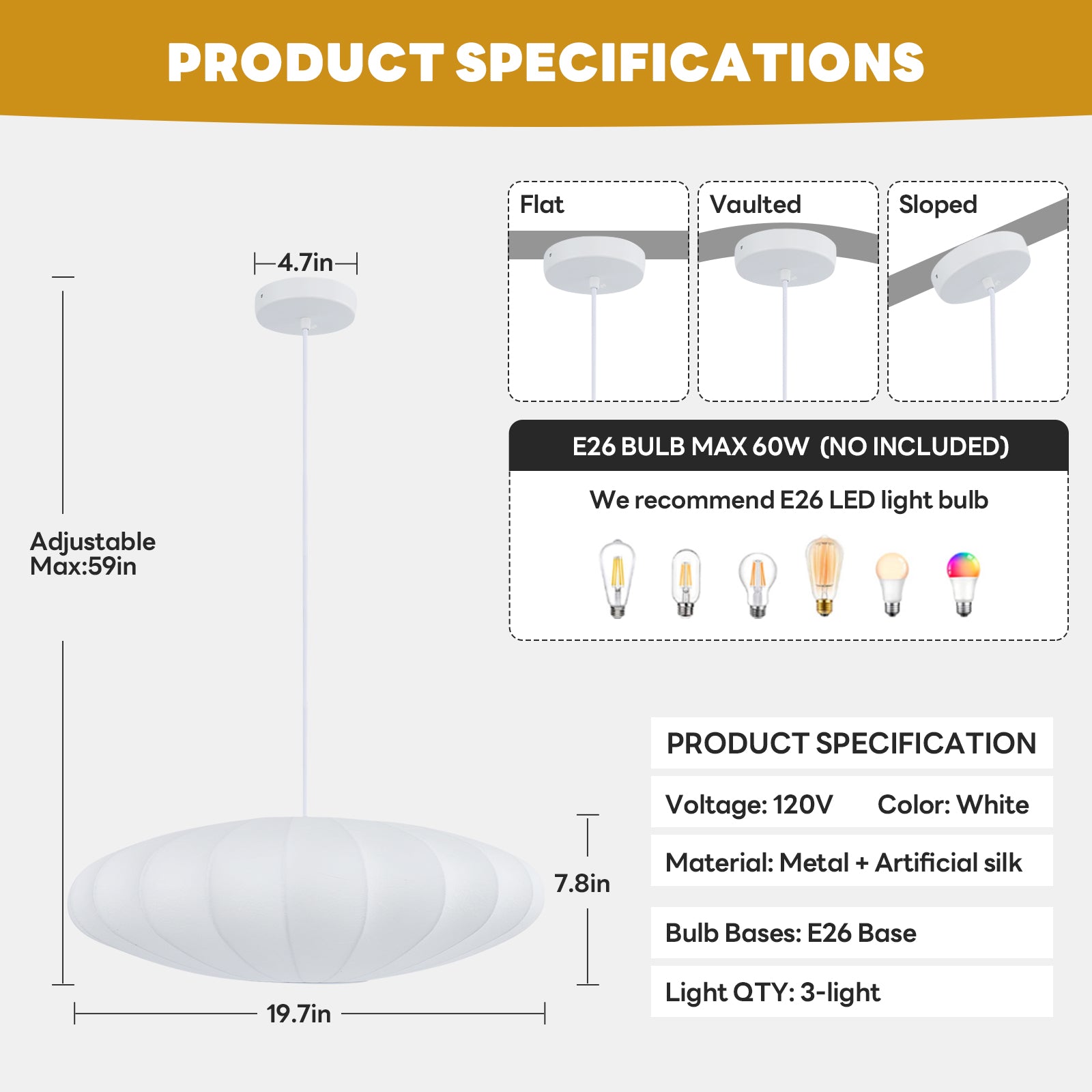 - Silk Pendant Light: The material of our white saucer pendant hanging lamp fixture are imitation silk and sturdy metal frame, not fabric cloth
